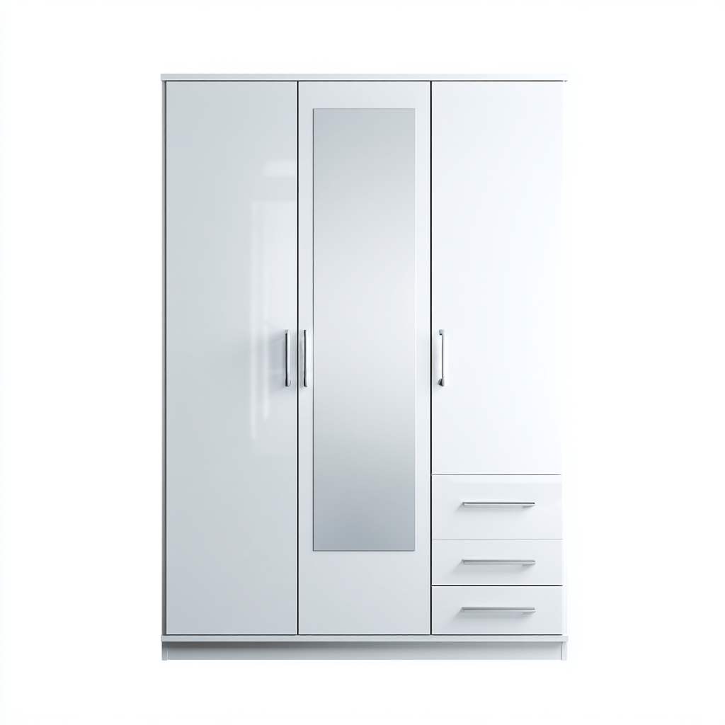Realizzato in legno ingegnerizzato con finitura bianco lucido, l'armadio presenta superfici lisce e uniformi, facili da pulire. Le maniglie in metallo garantiscono una presa confortevole e una buona resistenza all'uso quotidiano. Lo specchio integrato è adatto all'utilizzo quotidiano.