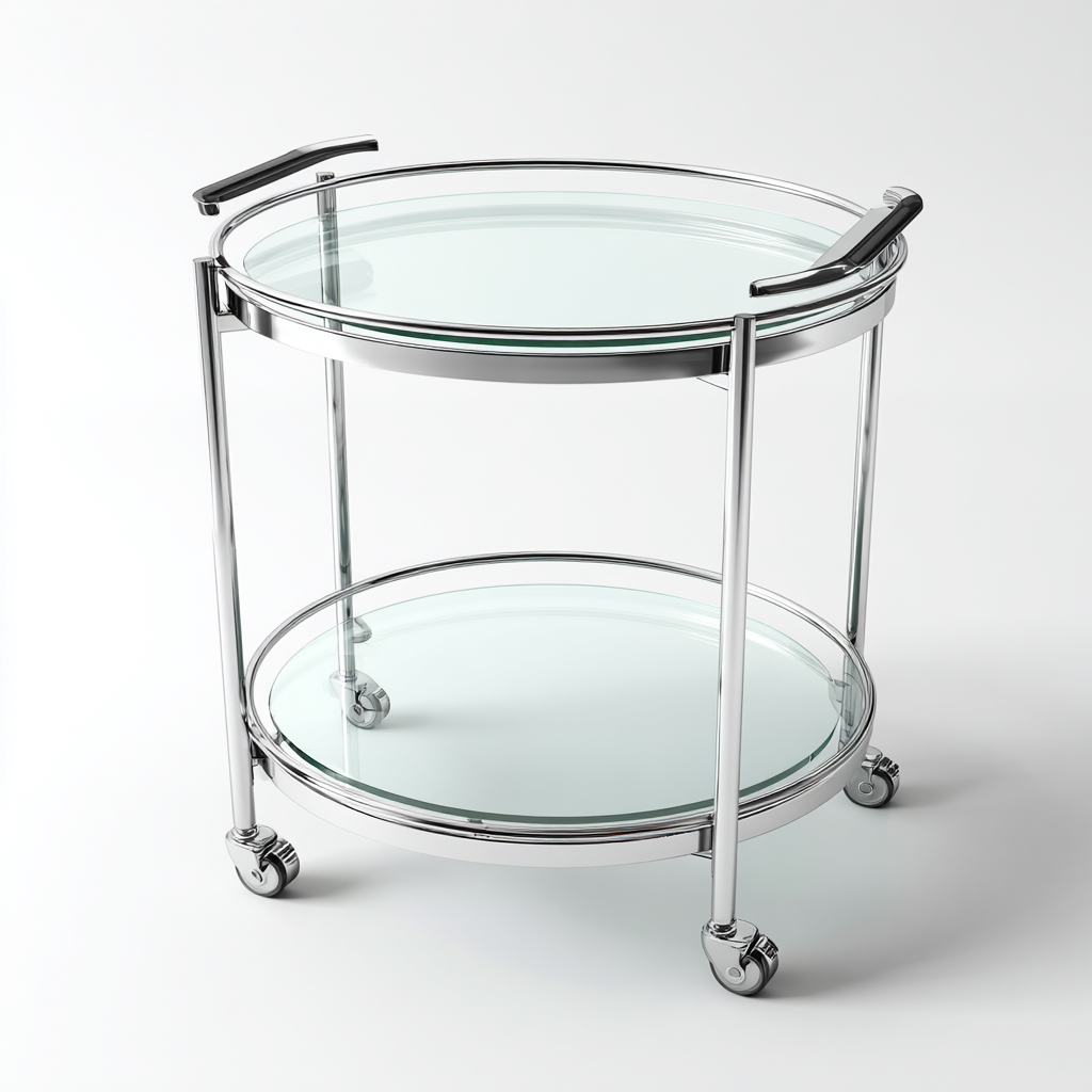 Carrello da cucina con struttura circolare dal design pulito e contemporaneo, pensato per il servizio e l'organizzazione in ambienti domestici moderni. La finitura cromata e le superfici trasparenti conferiscono un aspetto leggero ed elegante.