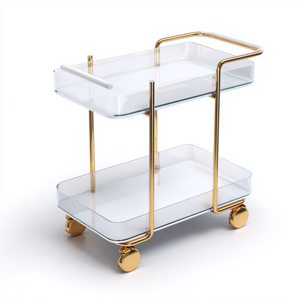 Carrello da cucina dal design pulito e contemporaneo, pensato per il servizio e l'organizzazione quotidiana. Le superfici trasparenti e la struttura con finitura dorata conferiscono un aspetto leggero e raffinato adatto a cucina e zona living.