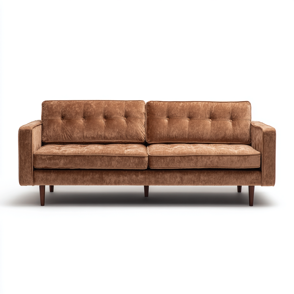 Rivestimento in velluto color marrone caldo con finitura morbida e uniforme. La struttura interna è progettata per garantire stabilità e durata, mentre la lavorazione con cuciture decorative sullo schienale conferisce un aspetto ordinato e curato.