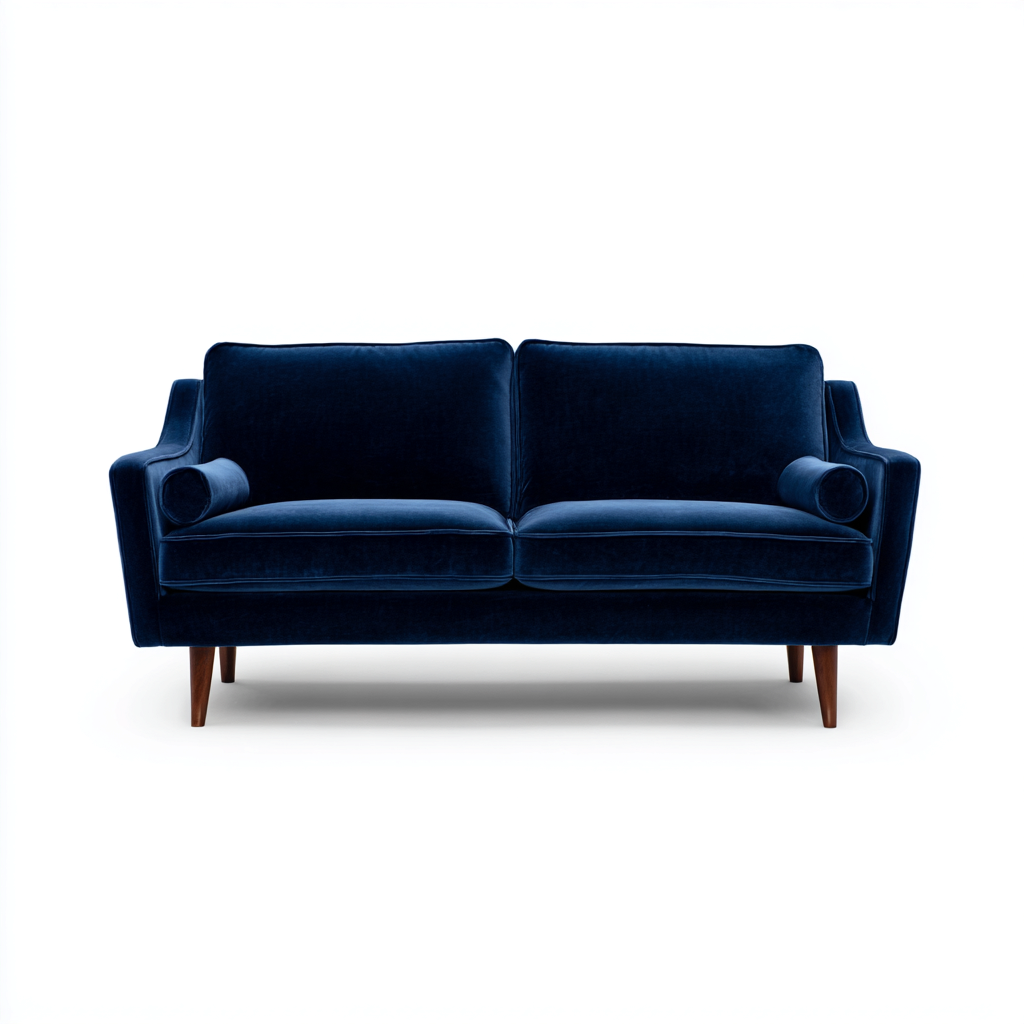 Rivestimento in velluto blu navy con superficie liscia e vellutata al tatto. La struttura interna è realizzata per garantire stabilità e durata, mentre i piedini in legno naturale offrono un sostegno solido e un contrasto elegante.