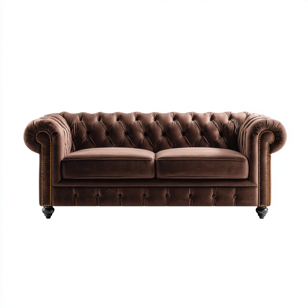 Rivestimento in velluto marrone scuro con superficie morbida e profonda. La struttura interna assicura solidità e stabilità, mentre la lavorazione capitonné dello schienale e dei braccioli valorizza l'estetica tradizionale.