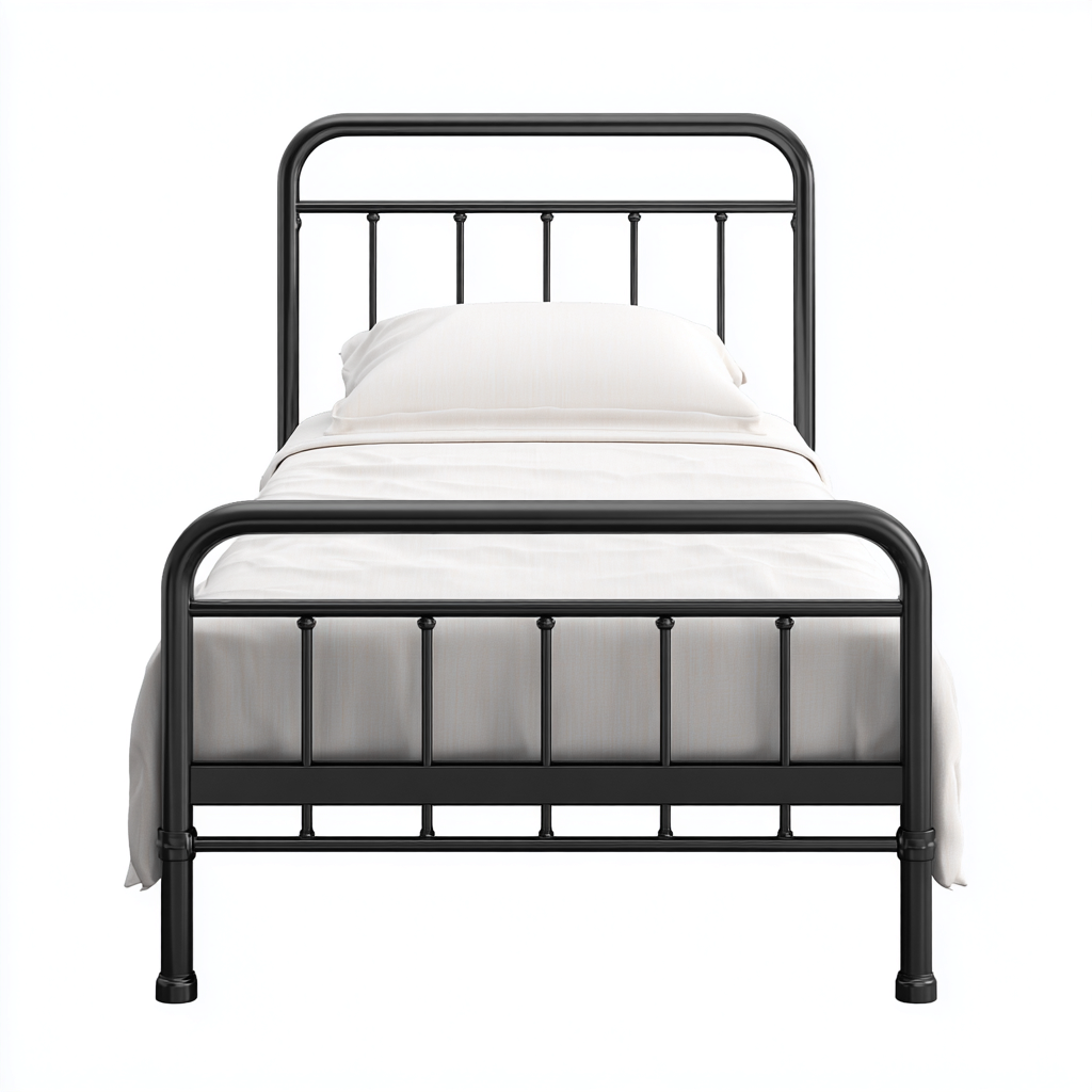 Questo letto singolo è progettato per l'arredo della camera da letto e si distingue per una struttura in metallo dalle linee essenziali. Il design pulito e simmetrico crea un aspetto ordinato e funzionale, adatto sia ad ambienti moderni sia a spazi dallo stile più sobrio.