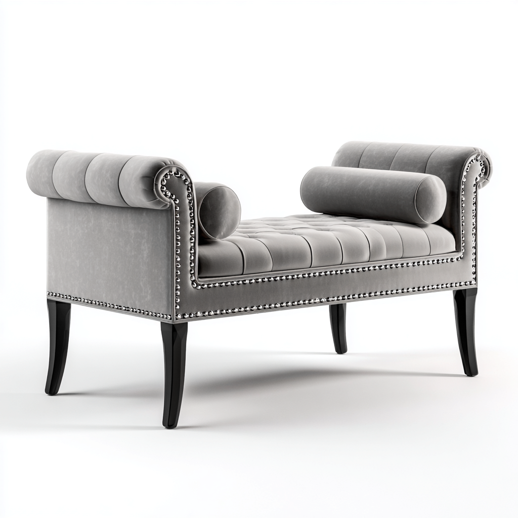 Rivestimento in velluto di colore grigio con superficie morbida e lavorazione trapuntata sulla seduta. La struttura è realizzata in legno con gambe rifinite in nero e profili decorativi in tonalità argento che valorizzano l'insieme.
