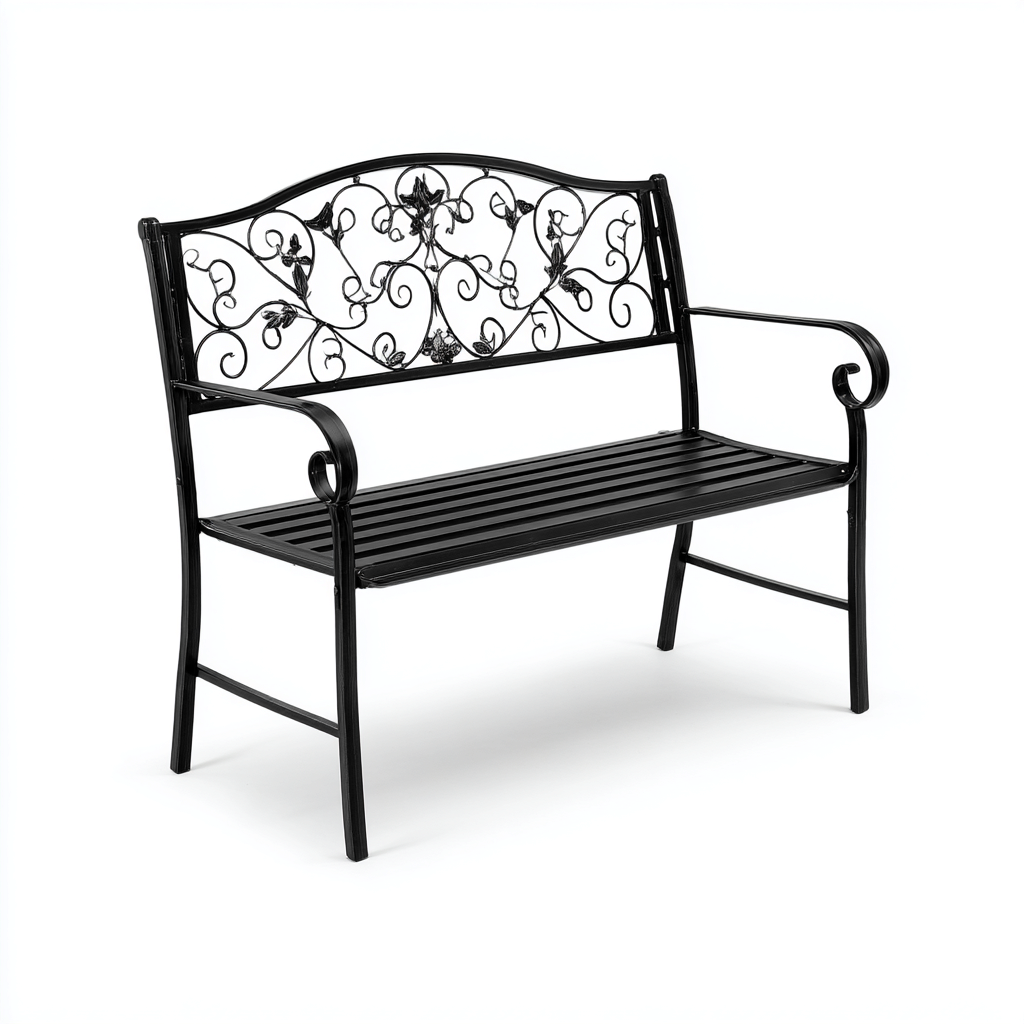 Struttura realizzata interamente in metallo con finitura nera. Le decorazioni dello schienale sono lavorate con cura e contribuiscono alla robustezza e alla stabilità complessiva della panca.