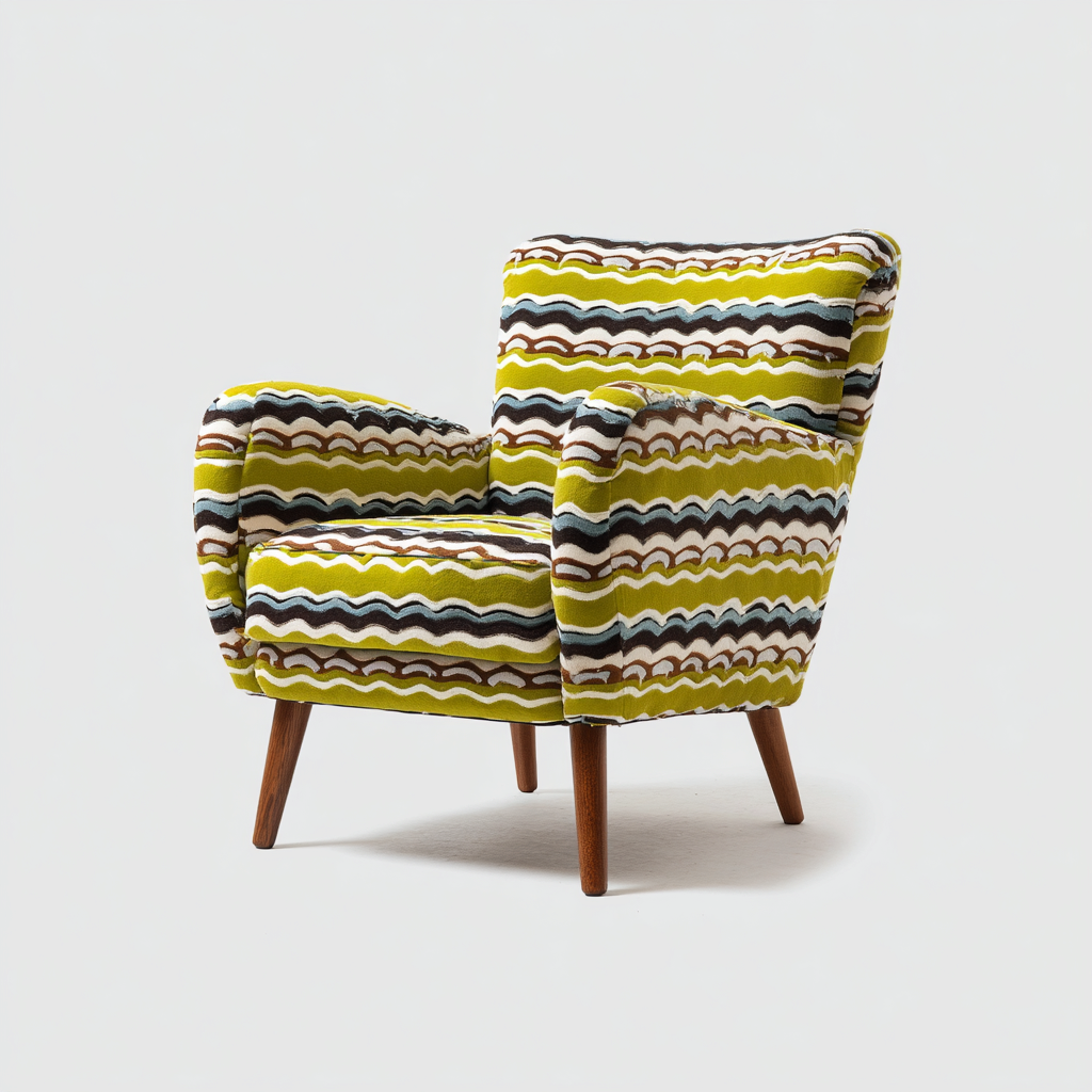 Il rivestimento è realizzato in tessuto multicolore con motivo decorativo, selezionato per offrire una superficie resistente e piacevole al tatto. La struttura portante e le gambe sono in legno massello con finitura naturale, lavorate per garantire stabilità e durata.