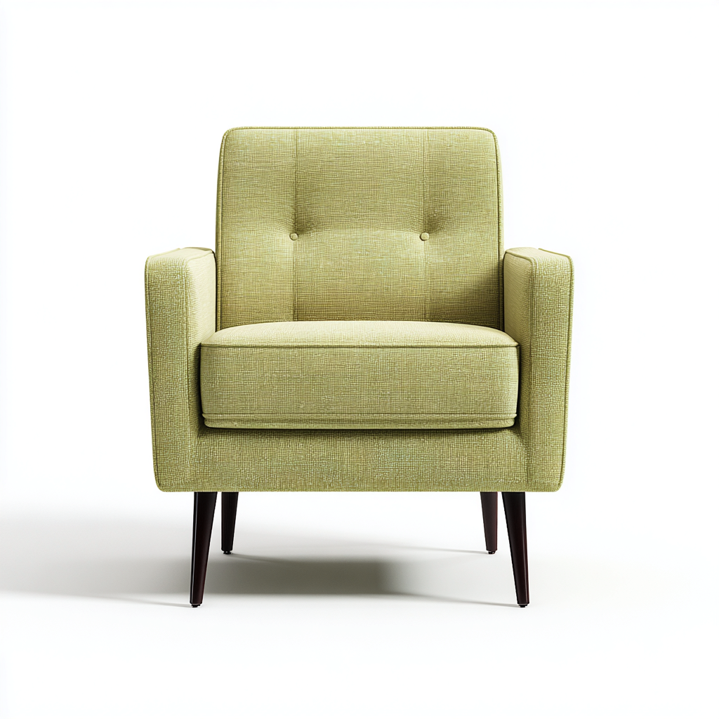Il rivestimento è realizzato in tessuto verde chiaro dalla trama fine e uniforme, selezionato per garantire una sensazione piacevole al tatto. La struttura portante e le gambe sono in legno massello con finitura scura, lavorate per assicurare stabilità e resistenza.