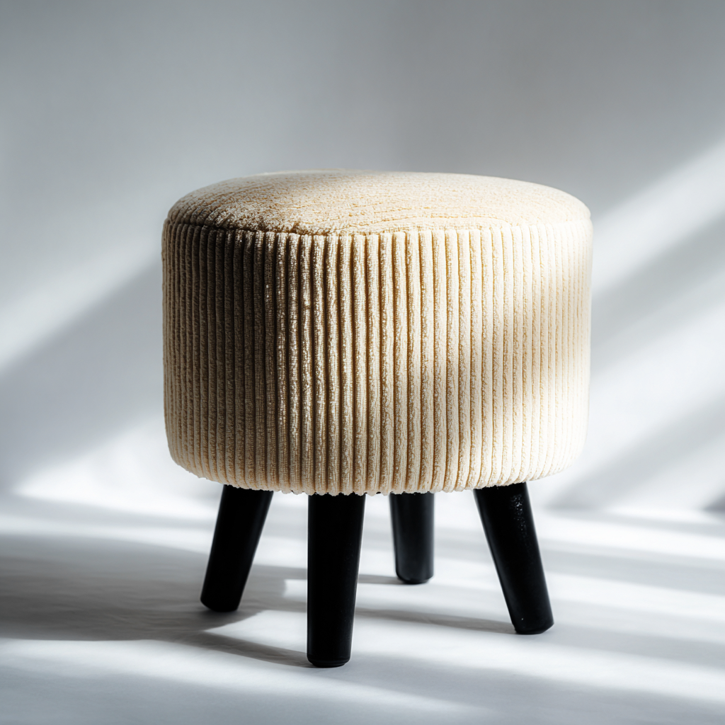 Il rivestimento è realizzato in velluto a coste di colore beige, con texture verticale regolare e finitura uniforme. Le gambe in materiale resistente di colore nero assicurano stabilità e un contrasto visivo discreto.