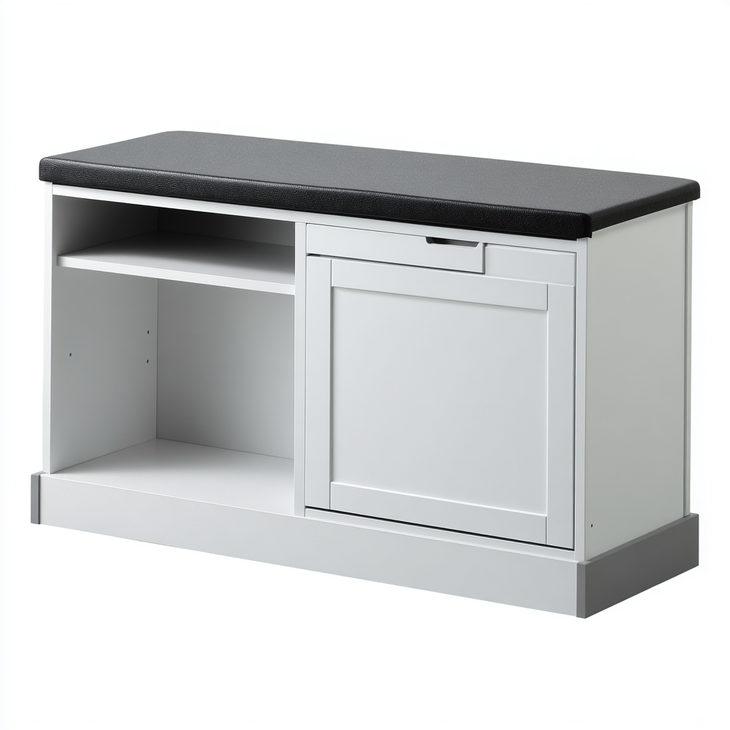 Struttura realizzata in legno ingegnerizzato con finitura bianca uniforme. La superficie superiore e rivestita in pelle sintetica nera con imbottitura compatta, resistente all'uso quotidiano e semplice da pulire.