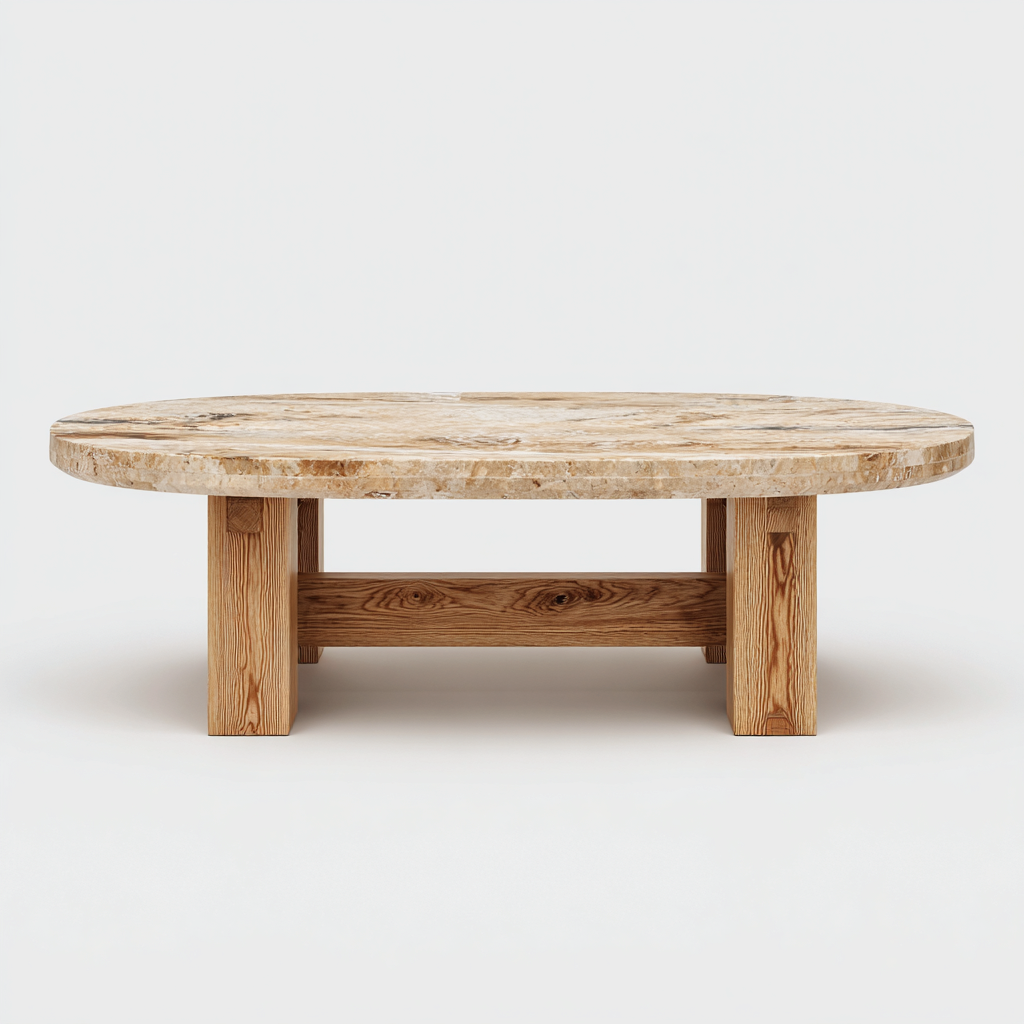 Questo tavolino da caffè presenta un piano ovale e una struttura solida, pensata per arredare il soggiorno con equilibrio e funzionalità. La combinazione di materiali naturali e linee essenziali lo rende adatto come punto d'appoggio centrale davanti al divano.